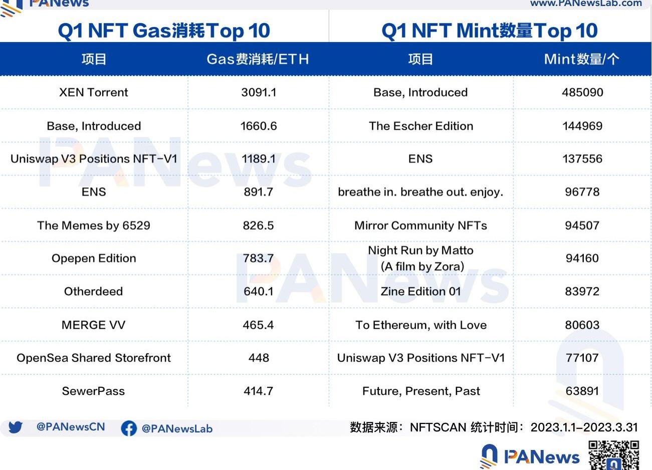 同時,藍籌NFT資產的抗風險能力減弱,本季整體成交均價平均下跌超23.1%,其中,CloneX、Moonbirds和Doodles價格跳水明顯,平均均價下跌47.3%;CryptoPunks、BoredApeYachtClub、Otherdeed和MutantApeYachtClub的均價略有下降,平均為8.7%。不過,藍籌NFT仍受市場資金青睞,整體成交量平均漲幅達14.7%,其中YugaLabs系的項目整體上漲明顯,平均漲幅達27%。與此同時,從以太坊的Gas消耗情況可以觀察出活躍的種子選手。第一季度Gas消耗Top10的NFT項目共消耗超1萬枚ETH,其中XENTorrent、Base,Introduced、UniswapV3PositionsNFT-V1和ENS是Gas消耗的主力軍,共累計貢獻了近四分之一的Gas消耗量。