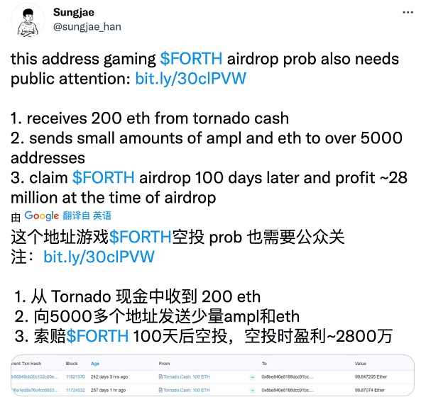 根據Sungjae的披露,至少從257天以前即今年的1-2月份時,該匿名人士經由以太坊上的隱私協議Tornado Cash上接收了200 ETH,然后給超過5000個地址發送了少量的AMPL代幣(調控AMPL算法穩定幣協議運行的記賬代幣)和ETH用以呈現交互,在AMPL協議宣布空投治理代幣FORTH的100天后該匿名人士獲利,僅在空投當時它就獲利2800萬美元。