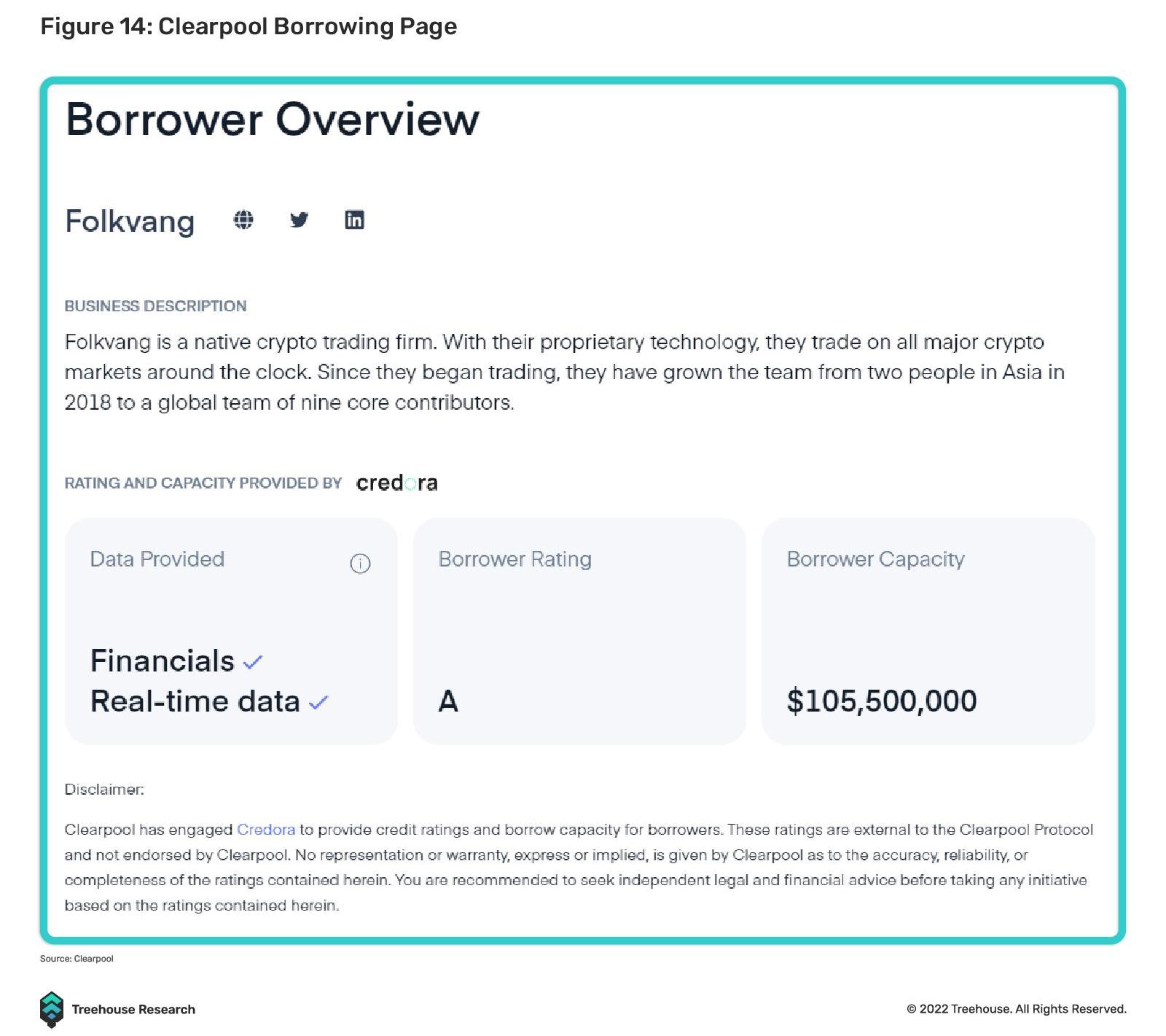 盡管前面有許多障礙,但DeFi信貸市場已經展示了其增長勢頭和培育創新的能力。作為TradFi中交易最頻繁的風險溢價之一,信用風險可能成為“實際收益率”敘述中的下一個重量級人物。對DeFi信用最有趣的觀察也許是這個市場的增長直接反對“DeFi”的去中心化。貸款人和借款人都自愿接受KYC和白名單以參與這些協議,將匿名放在較低的優先級。這種經過許可的鏈上市場可能是一個持久的趨勢,這將導致鏈上融資和投資活動的制度化程度提高,因為監管機構更深入地研究了他們以前無法觸及的交易和回報。這種發展的長期影響很難衡量,因為DeFi最初對隱私和分布式治理受到侵蝕的擔憂可能會通過允許無許可和算法信用評估的未來創新得到解決。拋開一切不談,我們Treehouse對成為DeFi信貸市場增長的一部分感到樂觀和興奮,因為我們的工程師正在努力整合信貸風險管理工具。我們認為,DeFi信貸領域的下一個明星項目可能會涉及工具和市場,這些工具和市場可以更有效地進行信貸交易,并在更多元化的借款人實體上進行交易,或者采用具有各種期限結構的索引包。