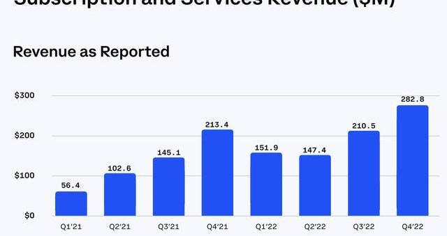 上表是Coinbase兩類交易者所貢獻的交易量占比情況。拆解來看,零售交易量從2021Q4的1770億美元下降至2022Q4的200億美元;雖然機構交易量也在下降,從2021Q4的3710億美元下降至2022Q4的1250億美元,然而其占比卻從68%上升到86%。這對Coinbase有利,它表明機構基金正在更認真地對待加密資產這一全新類別,同時這也證明了Coinbase正在贏得機構的信任。2022Q3,Coinbase被全球最大資管公司BlackRock選中為其Aladdin客戶提供加密交易通道。2023年1月,BlackRock選擇將比特幣作為投資標的添加到其全球配置基金中。在2022Q4的財報電話會議上,Coinbase管理層也表示,他們看到越來越多的機構投資者加入其CoinbasePrime計劃。“穩固”的第三個原因是Coinbase正在開辟新的收入類型。Coinbase正在通過質押和利息收入相結合,從其平臺上持有的資產中獲得收入。據財報,其2022Q4利息收入環比增長79%至1.82億美元。這主要是受利率上升的推動,使其托管的巨額客戶資產實現了不小的收益。另外,該公司的訂閱和服務收入同比增長32.5%至2.828億美元。這主要受益于CoinbaseOne計劃以及ETH質押增長的持續推動。