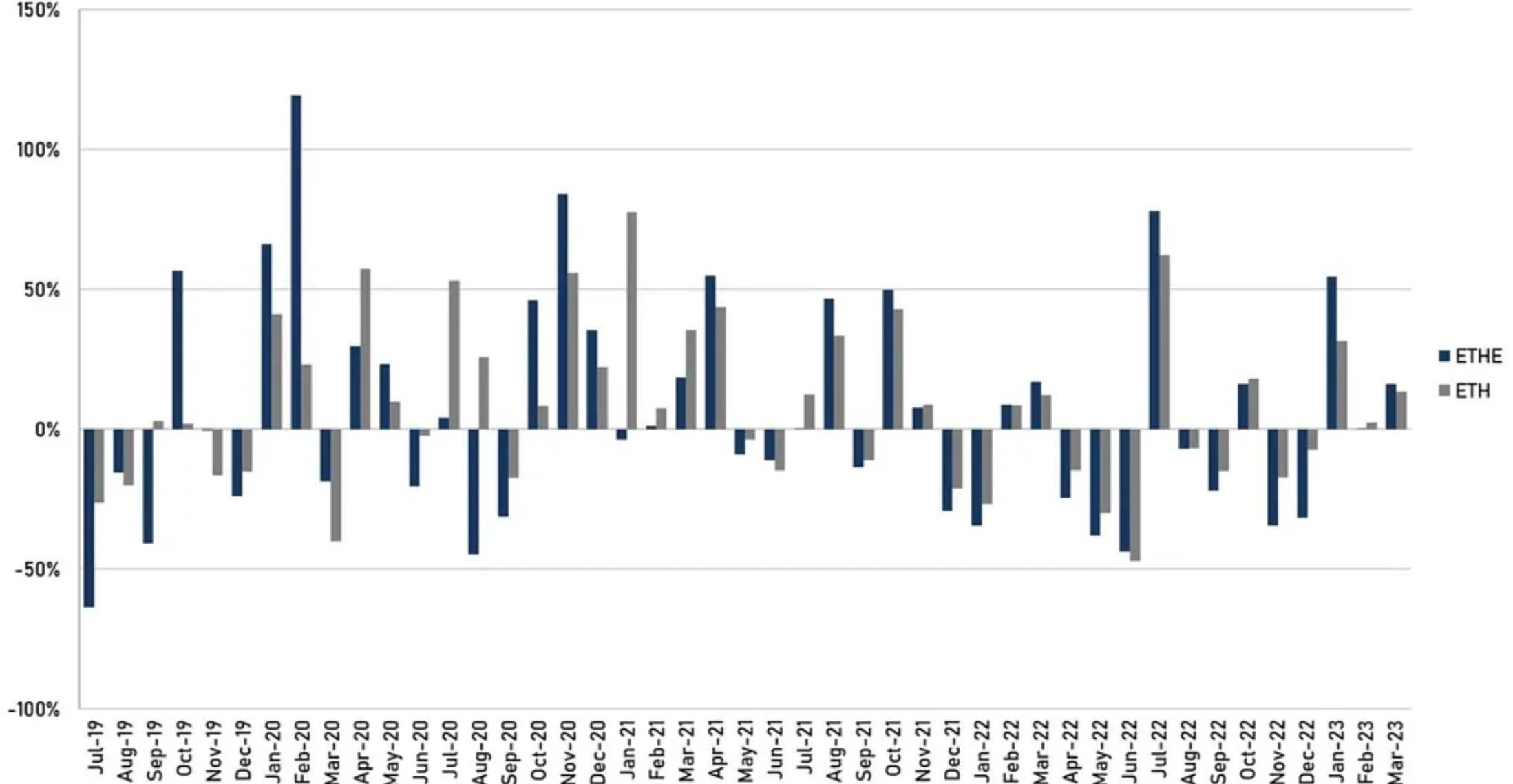 理論上ETHE價格應該圍繞ETH持倉價值上下波動,但實際上它的二級價格表現并非完全貼市,自ETHE2019年上市以來,歷史上曾經長時間維持著對ETH的正溢價,2019年上市之初一度超過1000%。自2021年2月后ETHE進入負溢價模式,并持續至今。圖1:歷史ETHE折溢價與ETH價格走勢