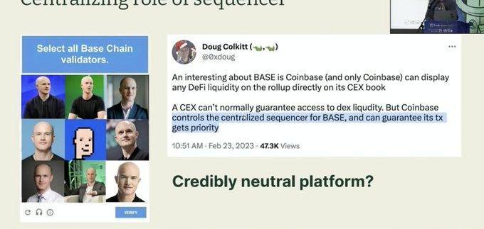 對此假設,MartinK?ppelmann又提出了L2新的問題。1、L2的sequencer非常中心化比如L2雖然沒法拿走你的錢,但是他們有巨大的權力——可以決定是否接受你的交易、收你多少Gas費以及誰在前誰在后。Martin還順道黑了一下Coinbase,說如果你要在Base上做交易所,它可以很輕松地把來自它的交易排在你的交易前面。