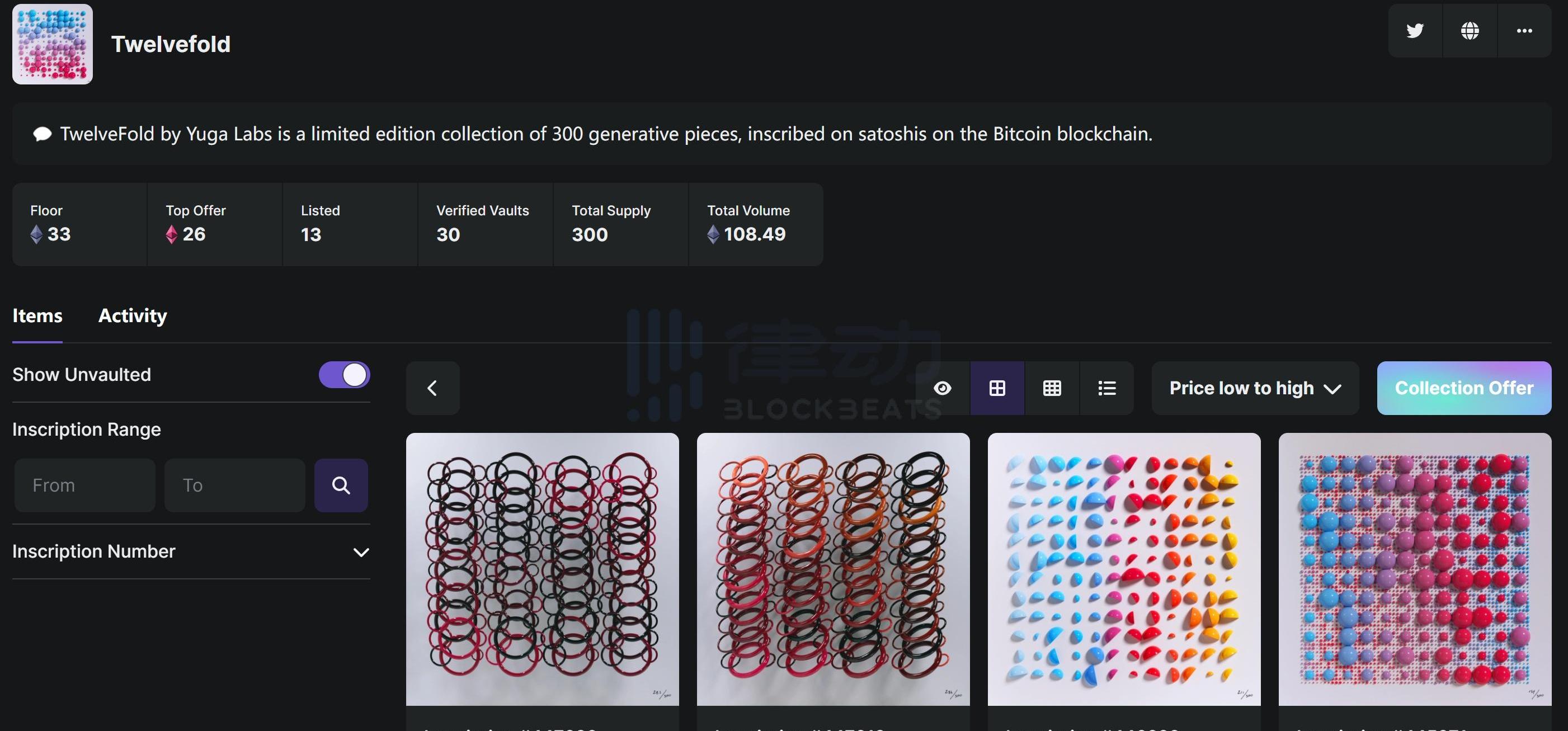 指ETH和Solana上的藍籌項目來比特幣網絡上發行的NFT項目,比如YugaLabs的「TwelveFold」還有DeGods的比特幣版本。這類項目已經具有很大的影響力,因此發售價格也都很高。YugaLabs的「TwelveFold」以競拍的形式出售了288個NFT,最高中標價為7.1159BTC,最低中標價為2.2501BTC,共獲得拍賣收入約1650萬美元。目前,在ordinals.market上,「TwelveFold」的地板價超過30ETH,累計成交額為108.49ETH。DeGods則是以0.333BTC的價格在2分鐘內賣出了500個比特幣版本DeGods。