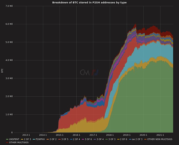 首先來看Schnorr簽名,前面我們提到聚合簽名可以使得多重簽名交易在鏈上顯示為正常的單簽交易,這就使得多簽交易會變得難以區分,單個交易難以被追蹤,這一點可以提高多簽用戶的隱私性。根據p2sh.info的數據圖表顯示,目前多重簽名的使用率處于快速增長狀態。這對于有著多簽需求的機構和普通用戶來說,Taproot升級將帶來使用體驗上極大的優化。