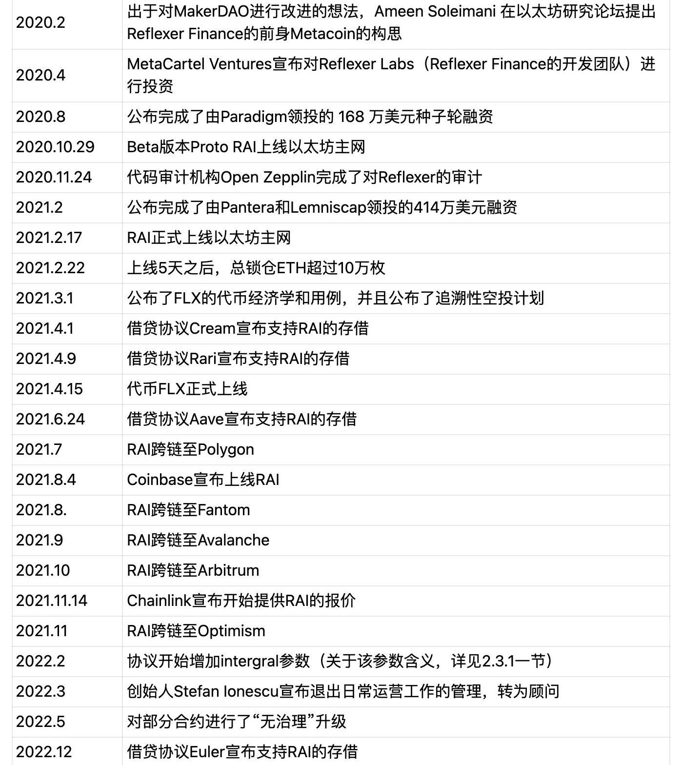 ReflexerFinance的唯一業務是“穩定幣”,由ReflexerLabs開發和運營。其核心業務流程比較簡單:用戶超額抵押ETH生成穩定幣RAI,用戶付出2%的年利息即可持續使用RAI。用戶償還RAI,并支付借貸利息,就可以贖回ETH。系統治理目前由治理代幣FLX的持幣者進行,長期他們希望實現“無治理”。與DAI和其他絕大多數穩定幣不同的是,RAI并不錨定任何法幣或實物,而是由市場供需關系來自動調節目標價格,最終達到其“基于ETH的低波動資產”的目標。具體我們將在2.3業務詳情一節展開。2.2項目歷史沿革和路線圖