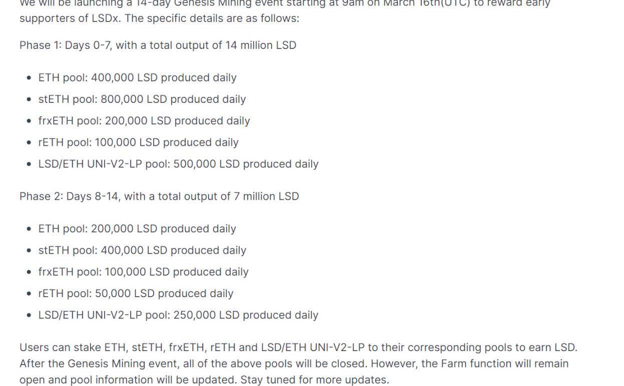 48小時鎖定量5.5萬枚ETH,2天增加了8000關注,代幣上了Bitget、MEXC,今天公布由ForesightVentures投資,可以看出團隊的充足準備。MarketCap:221萬美元TVL:1.34億美元目前支持的LSD數量也比較少,且功能未全部開發完成,還有很大期待空間,請注意16日之后的14天將是創世挖礦階段,獎勵將于4天后第一次減半: