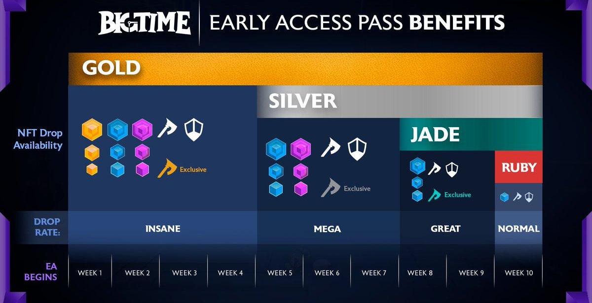 Bigtime于2022年4月19日開啟內測,游戲在PC端上線。持有VIP通行證可以參與內測,內測時有幾率爆出稀有款NFT,玩家獲得此類NFT后可以在Openloot市場進行交易。據社區反饋,歐皇玩家游戲過程中爆出超級稀有NFT后可當場回本。據官方信息,VIP通行證分為黃金、白銀、翡翠和紅寶石共四個等級。其中前三者均通過二級市場出售,紅寶石通行證僅對創作者、藝術家和社區的核心貢獻者免費開放。游戲內測進入模式為分批進去。持有黃金通行證的玩家最早進入內測,五周后白銀通行證玩家進入,八周后翡翠通行證玩家進入,2022年7月14日紅寶石玩家進入。玩家進入內測越早,游戲過程中獲得稀有NFT的爆率越高,同時游戲內會掉落一些SpaceNFT。