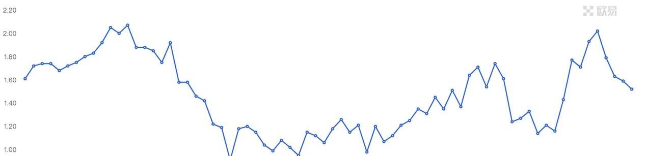 期貨多空比:1.8。散戶做多情緒較高,散戶情緒多為反向指標,1.7-2.0以上比較危險。多空比數據波動大,參考意義有所削弱。