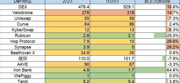 本周TVL較上周變化不大,略微下降0.11b,在layer2公鏈中,arbitrum持續上升3.8%,TVL上升至1.97b;optimism的漲幅最大,TVL達到了1b,相比上周也有10.76%的上漲。Avalanche的7日跌幅達到了6.81%3.各鏈協議鎖倉量情況