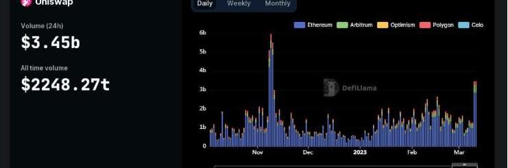 其次是Uniswap,Uniswap也是當前加密市場中交易量最大的DEX之一,USDC脫錨后的24小時內交易額飆升至34.5億美元,創下過去四個月以來的最佳表現。截至本文撰寫時,Uniswap用戶支付的交易費用也升至87.5億美元,觸及過去10個月以來高點。