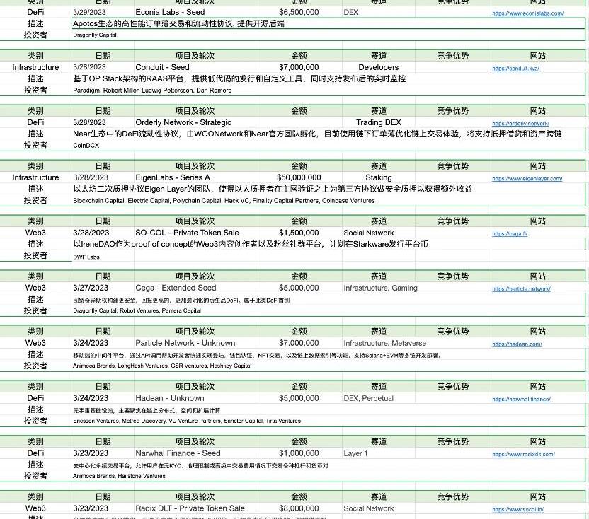 Blur的市場份額持續保持領先狀態約為79%,但相比上周小幅下降3%。從近期NFT項目活躍情況看,volume在5keth以上和10eth以上的項目近期都有回升的趨勢。市場交易無明顯熱點,本周NFT藍籌項目地板價逆轉了持續兩周的下跌,迎來一波不錯的上漲,Cryptopunck上漲8.32%%,BAYC上漲8.35%,MAYC上漲14%,Otherdeedforotherside上漲25%。六、項目最新融資情況