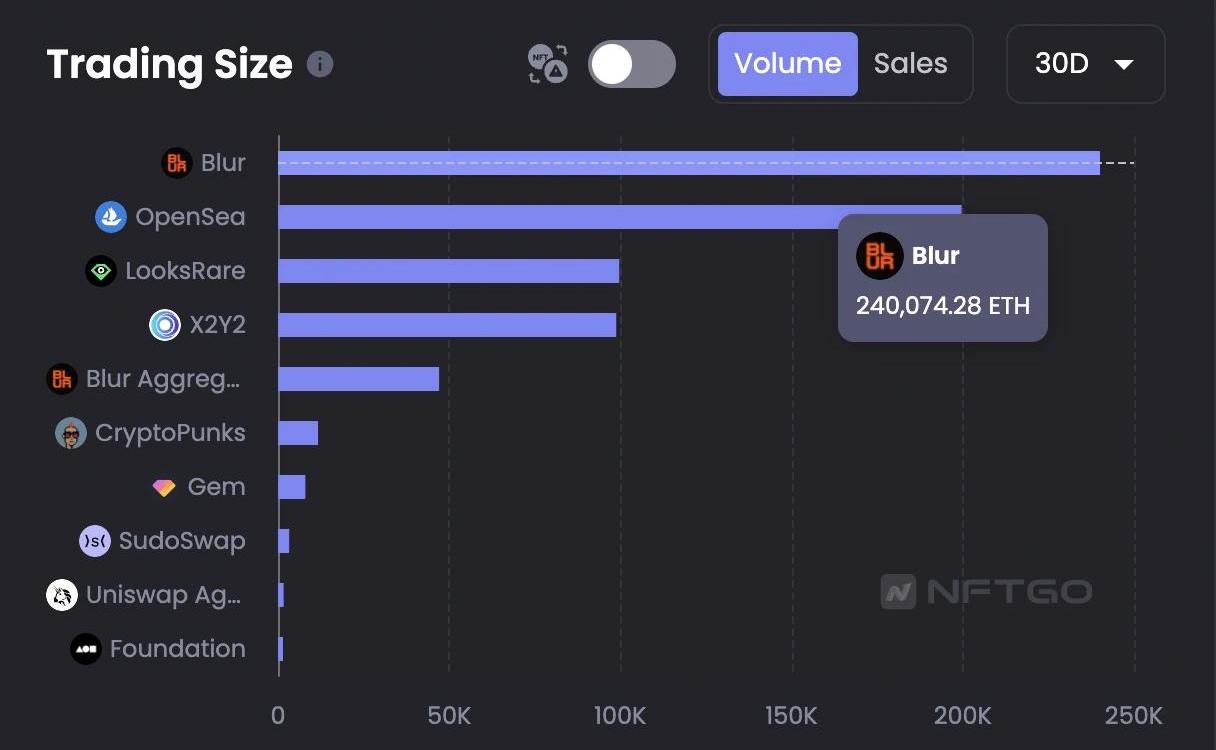 BlurBlur當之無愧是市場新來者中的佼佼者,自推出以來,就迅速且成功的占據了一些市場份額,并在各大平臺都引起了廣泛討論。與Uniswap一樣,它們都選擇在第一時間進行推廣宣傳,且都聲稱擁有流暢的界面體驗和一次購買多個NFT的背景實力。在一輪空投后的11月,Blur已占以太坊NFT市場交易的15%左右。在12月初發放的第二輪空投后,截止12月19日,過去一個月Blur的NFT交易量已經超過了Opensea,約占整個NFT市場份額的33.02%,成為當前鏈上交易量最大的NFT聚合交易市場。NFTGo的數據顯示,近一個月以來它的交易規模已經達到了240kETH,僅僅上線3個月,就超過了Opensea這些年的積累。