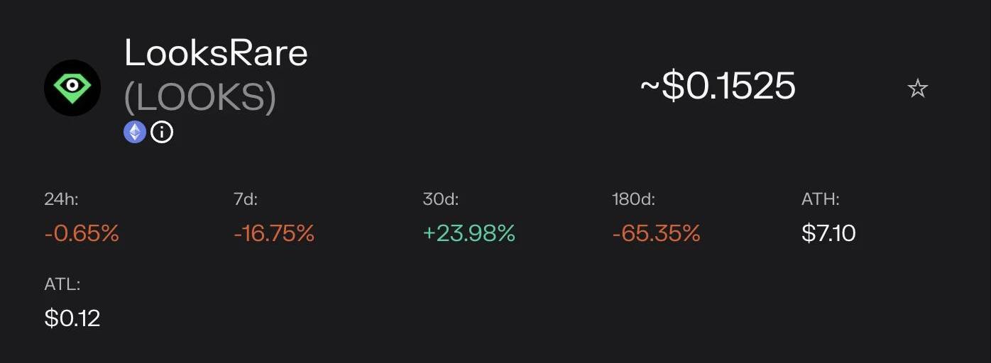 圖14:RoyaltyRateVs.Date至于“自定義版稅、零費用”的模式持續到何時,Blur官方表示將等待Token上線后再通過社區治理進行投票進行版稅、費用具體方案決策和討論,在此之前Blur不會賺一分錢。和Element不同的是,Element一次購買一個NFT和一次購買批量NFT所消耗的Gas費用是對等的,而Blur則是一次批量購買越多的NFT所消耗的Gas越大,這可能也是為什么Blur批量購買NFT幾乎不會失敗的原因。LooksrareLooksRare是一個以社區為中心的NFT交易平臺,它積極獎勵所有平臺使用者,在最初上線時便被打滿了各種標簽——“100%交易費由Looks代幣質押者共享”、“巨量空投”、“ByNFTpeople,ForNFTpeople”等等。LooksRare以其原生代幣LOOKS為賣點,向所有在6個月內在OpenSea上至少交易3ETH的NFT用戶發放空投,LOOKS代幣的空投有九個等級——用戶在OpenSea上交易的次數越多,可以領取的LOOKS代幣的數量也就越多。根據TokenTerminal上的最新數據可以看到,其原生代幣LOOKS價格在180天內的跌幅達到了65.35%,雖然在近一個月內價格上漲了23.98%,但相比于過去的大幅度下跌顯得于事無補。