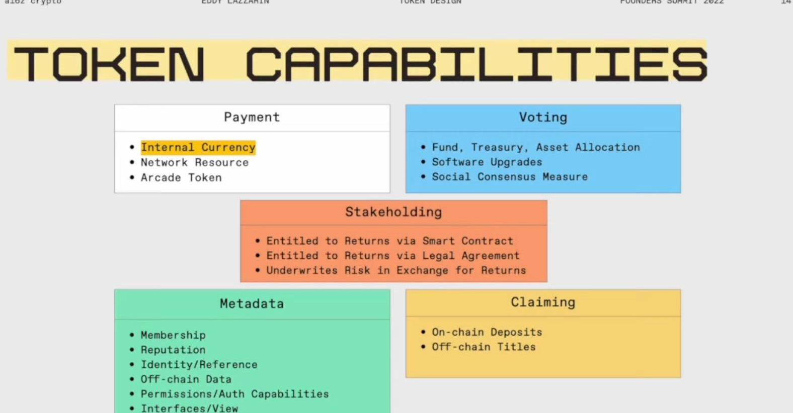 這不是完整的列表,我一直在與團隊成員討論這個問題,我相信我們很快就會進行修改,但這只是為了列舉我們迄今為止看到的代幣所表現出的所有能力。代幣是協議中的一種工具,它們是一種工具和協議,更抽象地說,它們是一種數據結構。那么,我們是如何看到這種數據結構被用于不同的協議中的呢?可以它們分成非常普遍的五類:支付、投票、利益相關、元數據和所有權,我相信隨著時間的推移,每一類都會有更多的解決方法,這種分組至少對我來說感覺是比較直觀的。