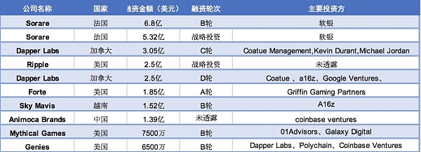 從單筆融資金額看,數字足球NFT收藏平臺Sorare以6.8億、5.32億美元的融資金額位列前茅。值得一提的是,《NBA Top Shot》開發團隊Dapper Labs完成了兩次過億美元的融資,兩次融資金額一共是5.55億美元,表現也非常出色。此外,融資金額過億的還有Ripple、Forte、Sky Mavis和Animoca Brands。
