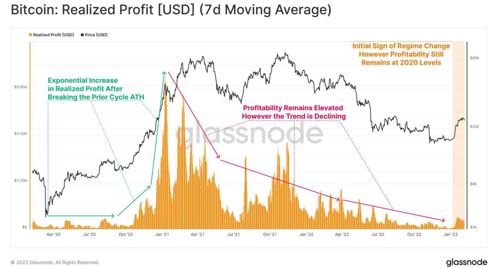 我們將從分析最近一個周期中市場鎖定的已實現利潤開始我們的調查。我們可以看到,2020年10月份之后,由于貨幣政策異常,獲利回吐現象激增。可以看出,自20211月達到峰值以來,這種情況急劇減少,在接下來的兩年內恢復到2020年的水平。最近的價格走勢反映出已實現利潤的復蘇,但對于2021-22年整個周期所經歷的繁榮,它仍是暗淡的。