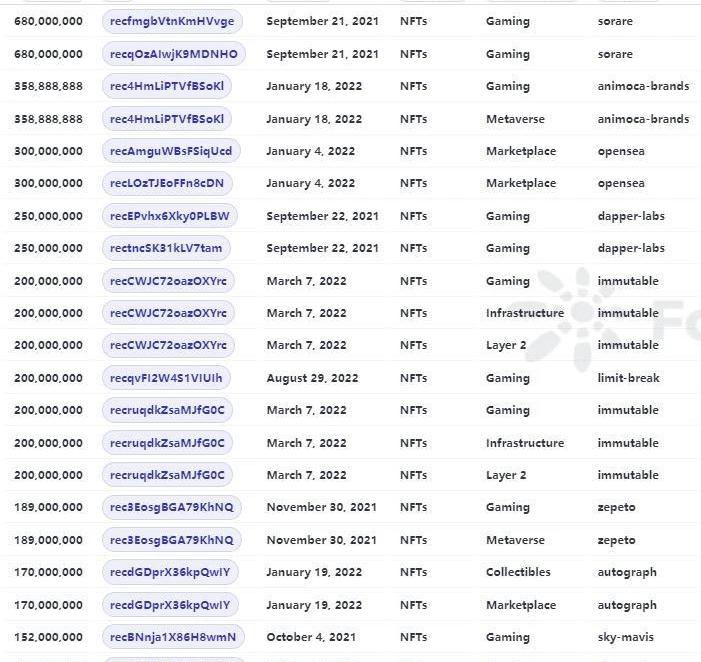 NFTsFundingRounds純NFT項目最大的兩輪融資是OpenSea和DapperLabs。OpenSea融資是2022年僅有的5個C輪或D輪融資之一。DapperLabs是NBATopShot系列背后的工作室。本文來自FootprintAnalytics社區貢獻。FootprintCommunity是一個全球化的互助式數據社區,成員利用可視化的數據,共同創造有傳播力的見解。在Footprint社區里,你可以得到幫助,建立鏈接,交流關于Web3,元宇宙,GameFi與DeFi等區塊鏈相關學習與研究。許多活躍的、多樣化的、高參與度的成員通過社區互相激勵和支持,一個世界性的用戶群被建立起來,以貢獻數據、分享見解和推動社區的發展。FootprintWebsite:https://www.footprint.networkDiscord:https://discord.gg/3HYaR6USM7Twitter:https://twitter.com/Footprint_Data