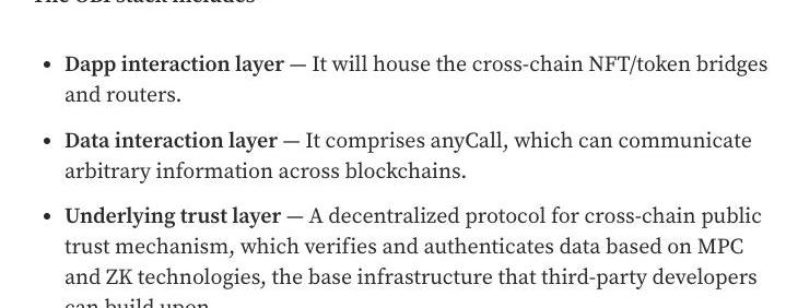 一、服務范圍足夠廣首先是服務覆蓋范圍方面,AlfredXu認為,跨鏈服務的價值就在于把一個個獨立的區塊鏈生態連通起來,讓不同的價值流動起來,所以生態及代幣的支持數量是評價一個跨鏈橋設施規模和能力的重要維度和指標。Multichain自誕生之初就很深刻地認識到了這一點。如前文所述,經歷了2022年的加速擴張,Multichain迄今為止已支持了81個區塊鏈生態上的3209個幣種,這其中既包括了跨鏈橋項目普遍支持的多個EVM鏈,也包括了Aptos、Cosmos、Polkadot、Solana等非EVM兼容鏈,甚至還包括了Bitcoin這樣的非智能合約鏈。全面的生態覆蓋能力很好地滿足了用戶在不同生態之間轉移資產的需求,Multichain也借此逐漸成為了許多用戶在執行跨鏈操作時的首選,而隨著用戶量的增長,Multichain流動性池的深度也在同步累積。龐大的流動性池允許Multichain處理其他多數同類項目所無法處理的超大額交易,這反過來又成為了Multichain最大的護城河之一,形成了正向的增長循環。二、產品功能足夠豐富其次是產品功能方面,AlfredXu認為,評估一個跨鏈服務的功能是否強大,要去看它是否擁有針對不同層級不同群體鏈間交互的解決方案。針對鏈間交互的不同層級,Multichain總結了一套被稱為OBI的定義分層法,從上往下會有三個分層——Dapps交互層、數據交互層、底部信任層。