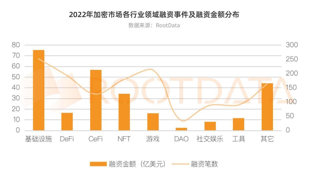 2022年加密風投的資金主要流入了哪些賽道?和2021年相比又有哪些變化?從投融資領域分布來看,2022年融資筆數排名前三的領域分別是基礎設施,游戲、DeFi,分別占總融資筆數的16.49%、13.94%、12.63%;融資總金額排名前三的領域分別是基礎設施、CeFi、NFT、分別占總融資規模的28.20%、21.22%、12.92%。