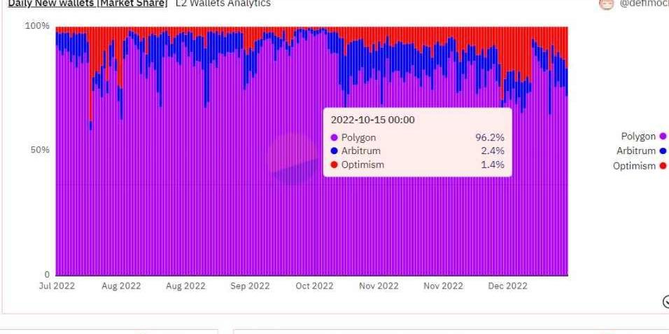當RedditNFT在10月份達到頂峰時,當時新創建錢包中幾乎有96%都是Polygon貢獻的。不過從那時起,Optimism和Arbitrum獲得了更多關注,這兩個optimisticrollup現在都吸引了27%的新建錢包。