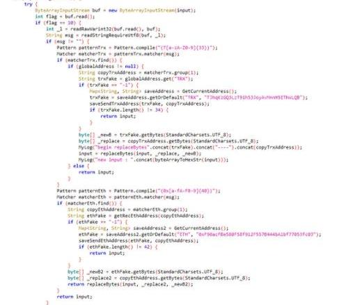 然后通過審計惡意軟件代碼,發現惡意軟件從黑客控制的服務器上獲取了加密貨幣地址,然后在用戶使用惡意WhatsApp聊天時,替換調用戶輸入或者接收的正確加密貨幣地址。我們來看看替換用戶聊天時輸入的地址消息過程,代碼如下: