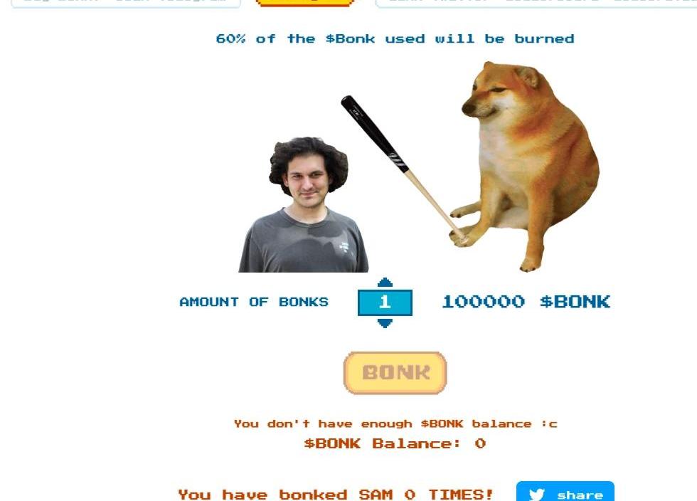 據官網介紹,BONK是第一個面向大眾的Solana版狗狗幣,BONK成立的目的是反對“Alameda”代幣經濟學,如Alameda在Solana上推出的欺騙性代幣FTT、SRM、OXY、MAPS等,這些全部都具有低流通量,高FDV的特點,這使得他們操縱價格更加容易,不僅擾亂市場,還讓大部分投資者損失慘重。而BONK希望制作一個有趣的meme幣,讓每個人都能得到公平的機會,不會讓投資者再次受到類似的價格操縱。在這層意思上,社區成員0xbustos還制作了一個BONKmeme游戲,游戲畫面是一只柴犬拿著棒球棒敲SBF的頭,你需要花費BONK代幣才能開始游戲。有社區成員甚至為其配上了廣告語“Feltangry,bonkedSamagain,feltgreat.”