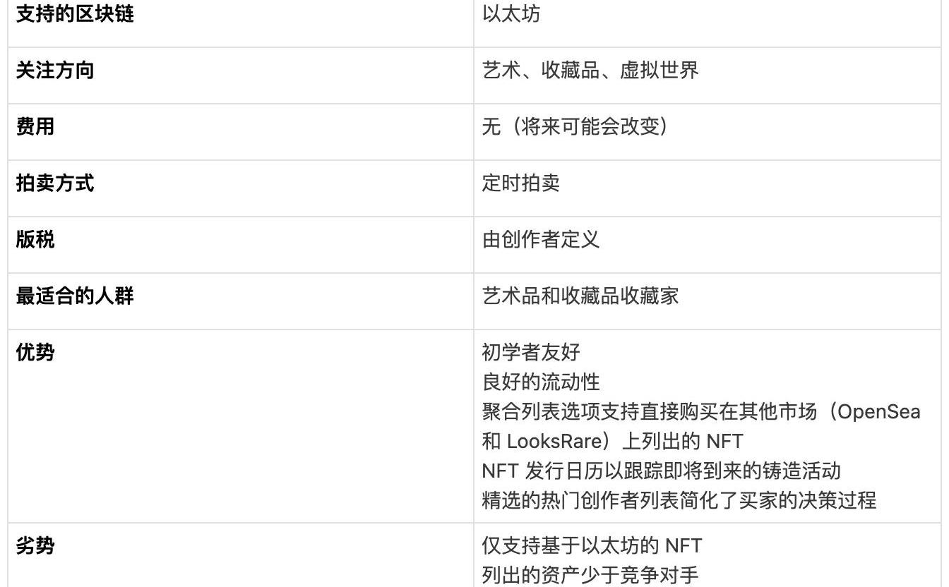 Rarible于2020年初推出,并在當年晚些時候NFT行業的采用率增加時占據了整體市場份額的很大一部分。Rarible是為數不多的擁有原生代幣的NFT市場之一,在平臺推出大約一年后發布了其RARI代幣。該代幣允許用戶影響平臺升級并訪問某些獨特的功能。RARI代幣持有者可以提交有關交易費用、新功能和相關治理提案的提案或對其進行投票。此類投票是建議性的,不具有約束力,因此Rarible團隊仍然擁有最終決定權。代幣持有者還決定展示哪些NFT。排在首位的NFT比埋在一長串列表底部的NFT更有可能吸引銷售。Rarible對創作者有著獨特的吸引力。它為買家提供了一個篩選器,以探索頂級影響者和藝術家。此功能允許創作者與各自的收藏家社區建立更緊密的關系。該平臺還提供了一個聚合器,允許用戶購買競爭對手列出的NFT。Rarible平臺上的NFT示例
