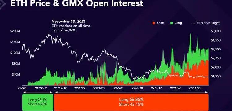 這是95%正確的。由于空頭頭寸可以在其他交易所獲得資金費用,但必須在GMX上支付借款費用,因此任何理性的交易者不會在牛市期間在GMX上做空。數據支持這一結論。GMX15個月的歷史可以分為兩個部分。第一階段從2021年9月1日到2021年11月10日,是一個短暫的牛市,ETH沖到了歷史高點。從2021年11月10日起的第二階段,是漫長而痛苦的熊市,ETH下跌了70%以上。盡管交易者在第二階段中做多和做空幾乎各占一半,但在第一階段,GMX95%的未平倉量都是多頭。歷史多半將在下一個牛市到來時重演。