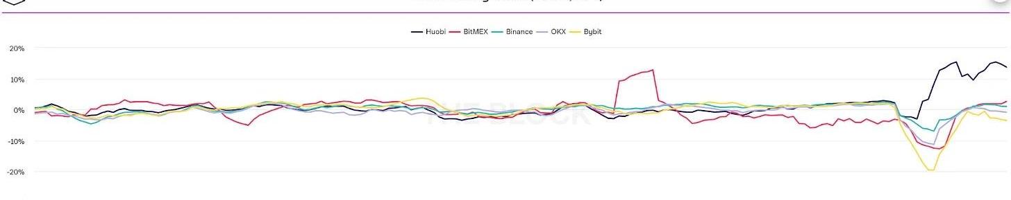 來源:DuneAnalytics做空帶來的供應增加,相關持有者的拋售壓力,以及缺乏吸收增加供應的需求,增加了USDT在3Pool中的比例。在主要的市場下跌期間,穩定幣的余額通常在USDT/USDC/DAI之間的1:1:1目標水平上下波動。最近的USDT流入已使資金池達到預期水平,其中38%的Curve3Pool池由USDT、USDC和DAI組成,分別占31%。Curve3Pool的穩定性,顯示出了支持主要穩定幣的信心。3Pool是行業內恐慌的“晴雨表”,USDT余額的資本重組是看漲鏈上信號。雖然在3Pool中USDT、USDC和DAI之間的比例關系仍然受到快速波動的影響,但該比例的穩定表明,市場預期在不久的將來會出現穩定或積極的表現。3.資金費率為負,價格穩定