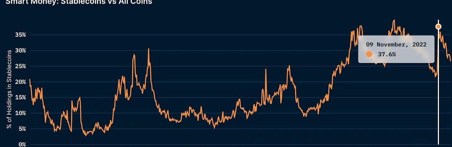 “聰明的錢”對穩定幣的配置在11月9日達到38%的峰值后一直在下降。