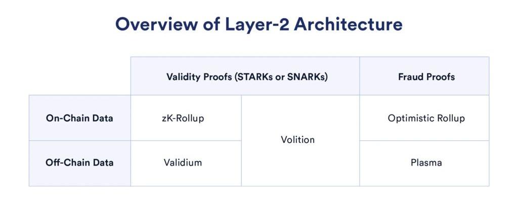 Layer2方案可以采用有效性證明或欺詐證明,并可以將數據儲存在鏈上或鏈下。基礎架構