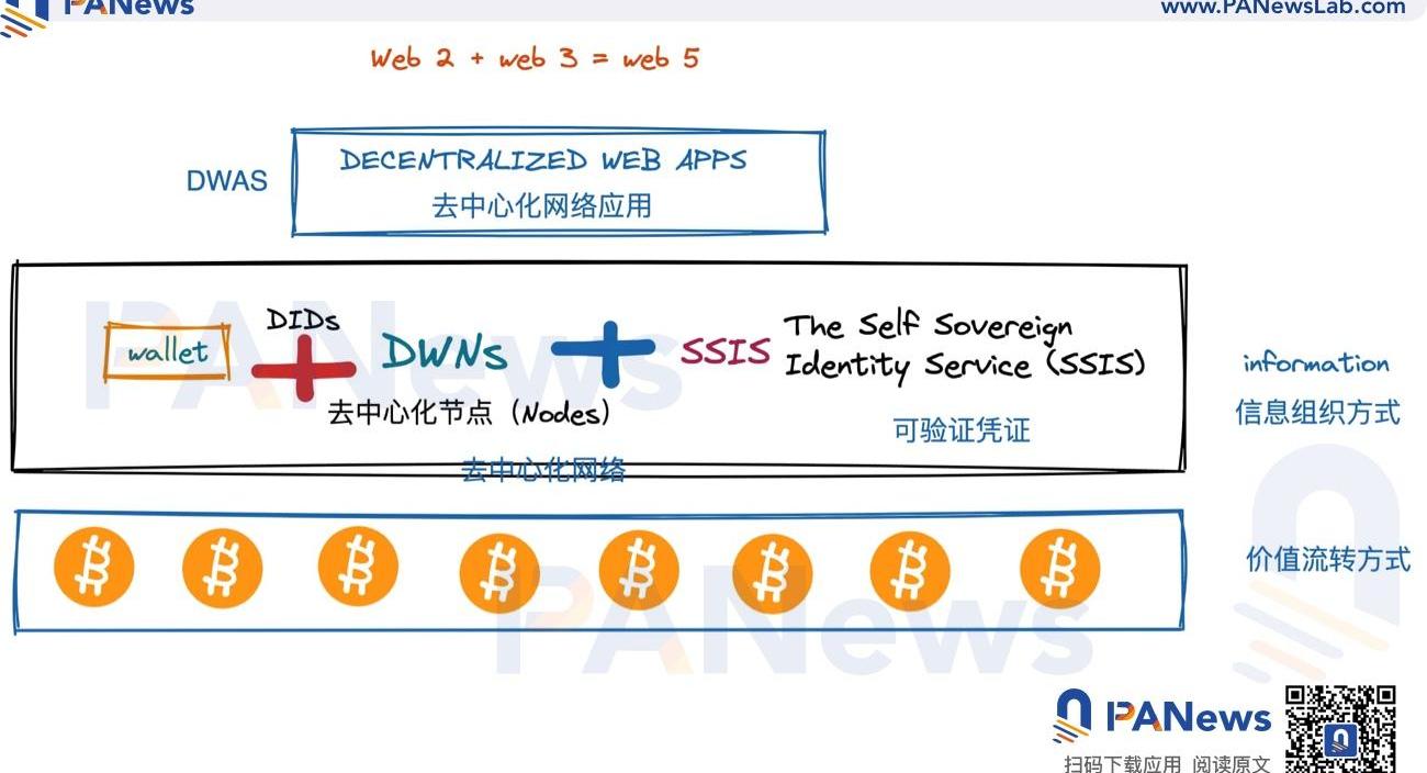 在TBD的開發設想中,Web5是一種網絡通信設施,是互聯網的最底層模型,其本身就是一種網絡,目前的萬維網才是Web5的對標物,而不是跟以太坊或者比特幣一樣的Layer1公鏈,這也是其最容易被誤解的地方。在其內部,可以將其劃分為作為入口功能的DID/Wallet部分,以為作為VC部分的驗證套件,信息在DWNs之間安全流轉,而這些統一構建成DWP。在網絡之上,是DWA,而比特幣、閃電網絡以及Circle構成了真正的加密貨幣流轉模塊,可真正將加密貨幣和網絡通訊鏈接去起來,這也是Web5結合二者的真正途徑。