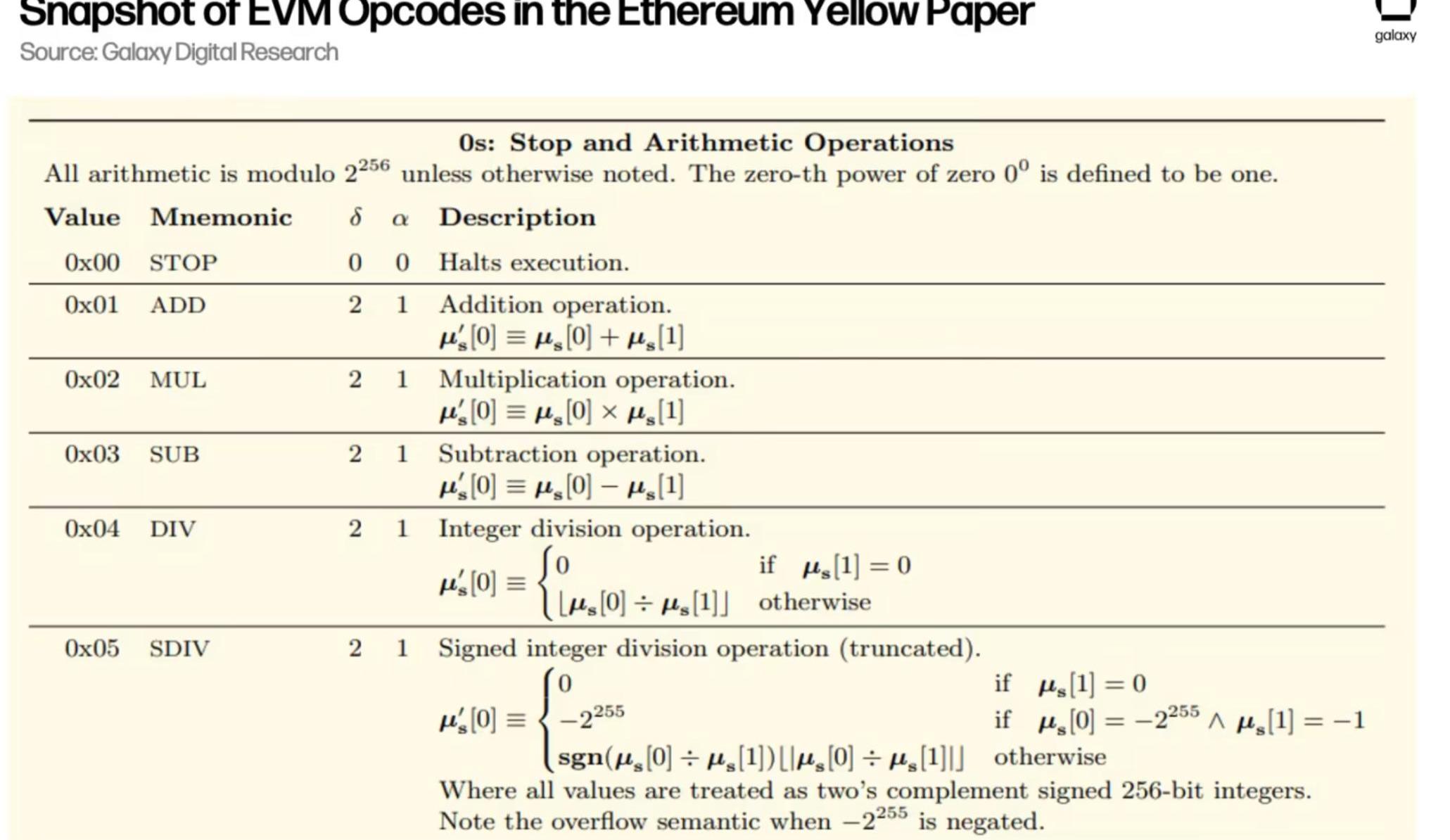 一旦交易被包含在以太坊上的一個區塊中,它們就會通過稱為以太坊虛擬機(EVM)的自定義運行環境執行。EVM旨在在以太坊上部署任意復雜度的代碼,這是使以太坊成為通用區塊鏈的根本,有時也稱為圖靈完備系統。EVM執行交易的方式存在一定規則。首先,EVM將人類可讀的編程語言編譯為面向機器或「低級」語言,稱為EVM字節碼。然后,EVM將字節碼解析為稱為「操作碼」的順序指令列表。每個操作碼命令EVM執行不同的任務,并以十六進制形式在EVM字節碼中表示。例如,在鏈上執行智能合約時命令EVM保留瞬態數據的操作碼以助記符表示為「MSTORE」,或以十六進制形式表示為「0x52」。為了幫助讀者概念化操作碼,以下是以太坊黃皮書中定義的簡單操作碼: