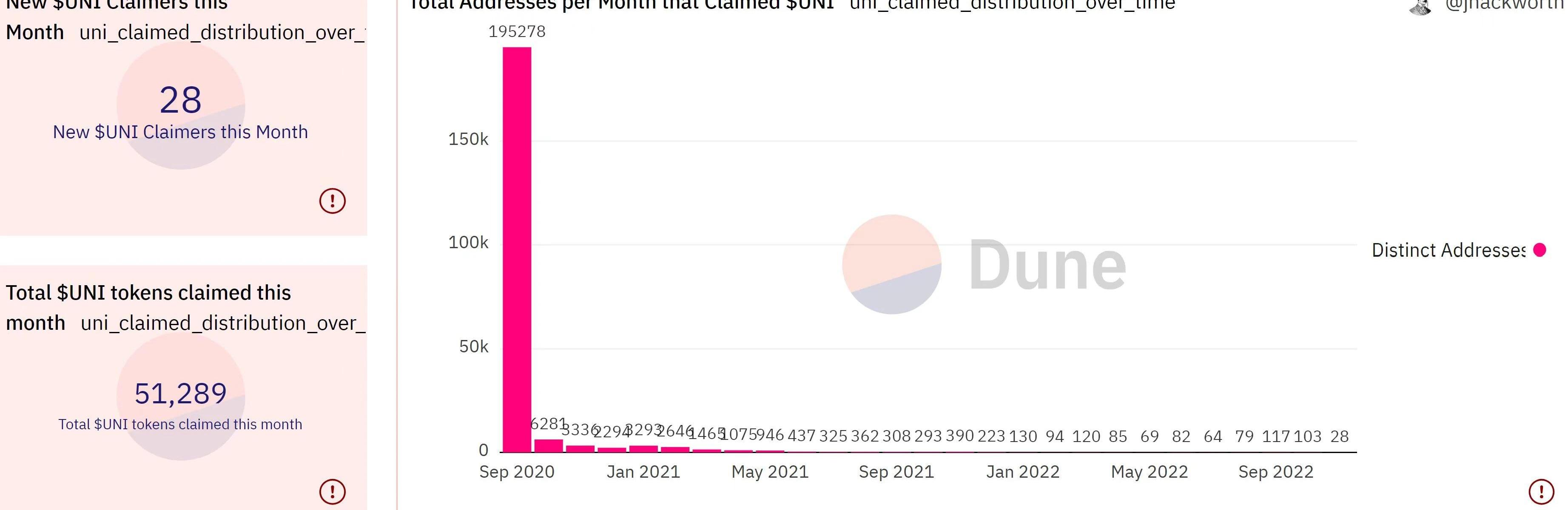這個問題很復雜,很大程度上取決于我們對“有效”的定義。為了進行研究,我們需要深入研究鏈上數據。空投通常的目標:獎勵忠實用戶,有些空投可以幫助項目獲利;營銷——大肆宣傳,獲得關注,增加采用;將平臺“去中心化”,將治理權分配給社區。我們將深入研究史上最大的空投之一——Uniswap在2020年9月的UNI空投。這是行業歷史上規模最大、知名度最高的空投,并催生了無數的模仿者,重新點燃了人們對該模式的熱情,幫助Uniswap占據了市場主導地位,并演變為一個固定的模式。兩年過去了,Uniswap似乎并沒有滿足人們的愿望,讓我們來看看原因。Uniswap空投