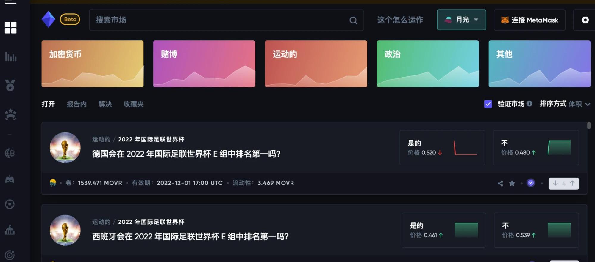 Polkamarkets和Polymarket一樣,Polkamarkets也是一個去中心化的預測市場,除了運行的鏈不同外,最大的區別在于Polkamarkets更注重世界杯市場,從下圖中可以看出,當前Top5的預測產品都是關于世界杯的。