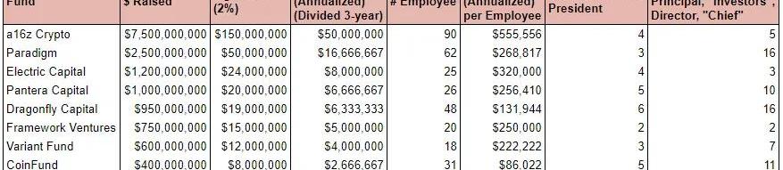 一些相關的數據和信息說明:√管理費是2%在現實中,情況會有所不同。這取決于基金發布后數年的資產凈值。這也取決于與不同類型的有限合伙人的具體協議。在一些司法管轄區,特別是新興市場,由于行業動態與美國金融市場成熟度不同,費用也往往略低。√基金投資周期是3年實際上,大多數這樣的公司在完全分配現有基金的收益之前,很可能會募集另一只基金。一般需要3年時間部署資金,兩年時間回收和分配收益。大多數信譽良好的基金將能夠在5年周期結束前籌集到新的資金,為繼續運營帶來更多管理費。√雇員:信息來自這些基金的官網GP、管理合伙人、創始人、總裁一欄跟蹤基金的最高領導層。最右邊的一欄記錄了擔任高級管理職位的員工數量,包括GP/MP以外的“合伙人”,以及業務負責人、董事和其他C級高管。√我相信其中部分數字是有改進空間的,但這里的重點是要有一個如何評估這些風投的起點。由于每個基金的薪酬結構不同,其準確性必然會有所不同。√這些都是頂級的加密基金,得益于過去兩年的牛市,它們為獨角獸提供了資金,所以我相信它們都不會真正陷入困境。我希望展示的是風投基金在市場低迷時期的表現。一些發現