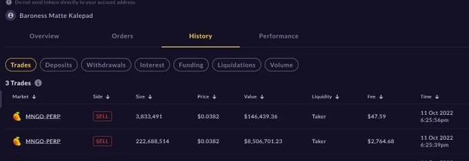 結合加密研究員@JoshuaLim以及@Mango官方的事故報告,我們將本次攻擊過程進行還原,大致如下:黑客首先向Mango交易所A、B地址分別轉入500萬美元,兩個地址分別是:A:CQvKSNnYtPTZfQRQ5jkHq8q2swJyRsdQLcFcj3EmKFfX;B:4ND8FVPjUGGjx9VuGFuJefDWpg3THb58c277hbVRnjNa;而后,黑客通過A地址在Mango上利用MNGO永續合約做空平臺幣MNGO,開倉價格0.0382美元,空單頭寸4.83億個;與此同時,黑客在B地址上做多MNGO,開倉價格0.0382美元,多單頭寸4.83億個。