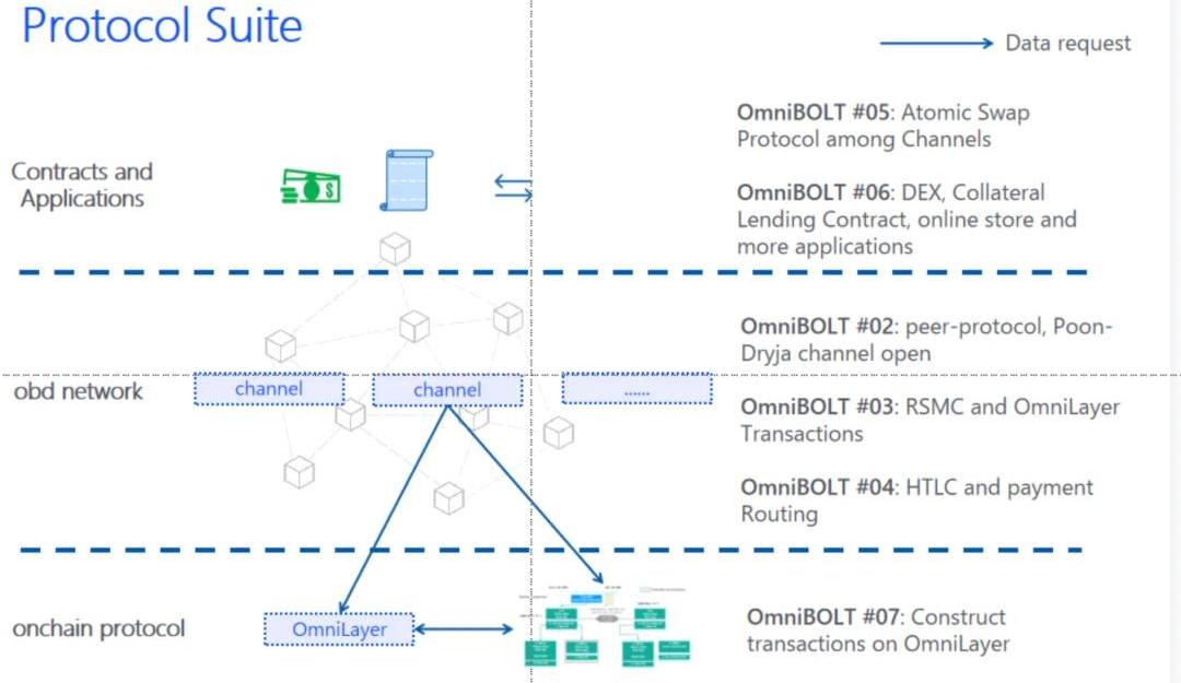 上文已經提到,BOLT代表閃電網絡技術基礎,這是閃電網絡的實際標準。基于這個標準,閃電網絡能夠兼容比特幣、萊特幣。但是,那些基于OmniLayer的Token被排除在外。為了解決這個問題,Omni提出了OmniBOLT協議,使得以USDT為代表的一系列Omni-aware資產和穩定幣都可以接入閃電網絡。此外,它還允許多鏈資產在onionnetwork網絡內交互。隨著OmniBOLT的出現,使得通過一個協議將所有區塊鏈和相關的數字資產進入按照閃電網絡規范設計的通道成為可能。通過OmniBOLT標準,它完整實現了可感知資產的閃電網絡節點,并且致力于鏈接不同的公鏈和生態,提供對外一致的接口和用戶環境,其核心的產品和標準除了OmniBOLT協議外,還包括OBD網絡。OBD網絡