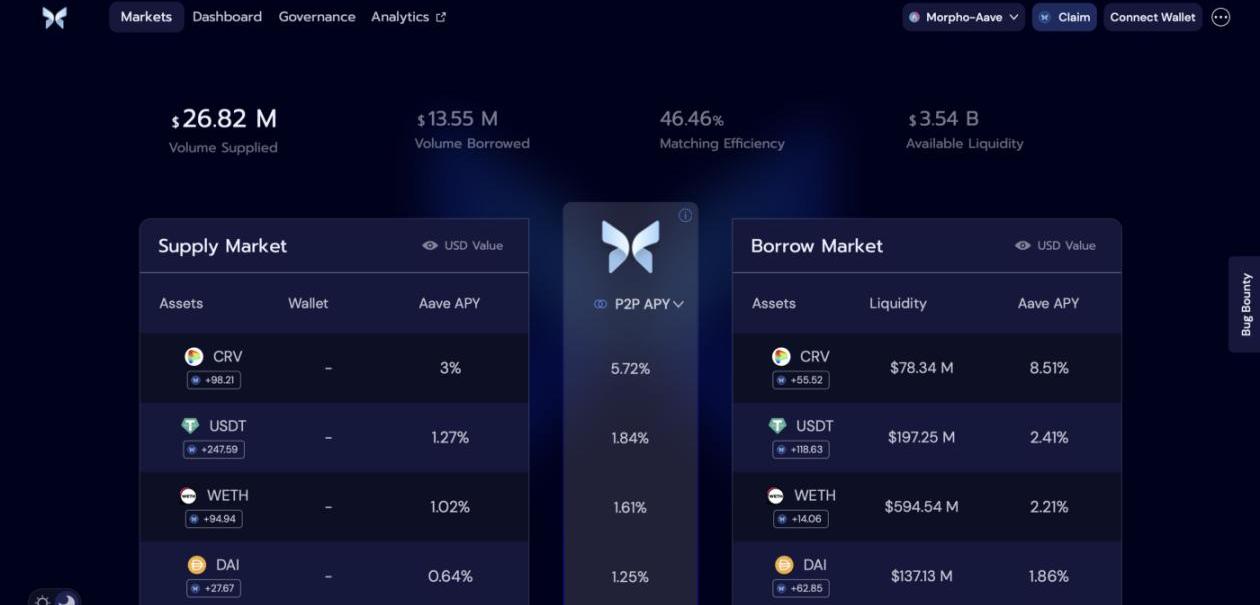 Morpho是在Compound或Aave等借貸池之上的點對點層。他們建立了一個貸款池優化器,可以為供應商和借款人無縫提高利率,同時保持相同的流動性和清算參數。簡而言之,Morpho-Compound是Compound的升級版,Morpho-AAVE是AAVE的升級版。幾天前,他們剛剛宣布了他們的ERC-4626與適配器合約的兼容性,用于一鍵集成希望為Morpho提供資金的協議。FraxFinance