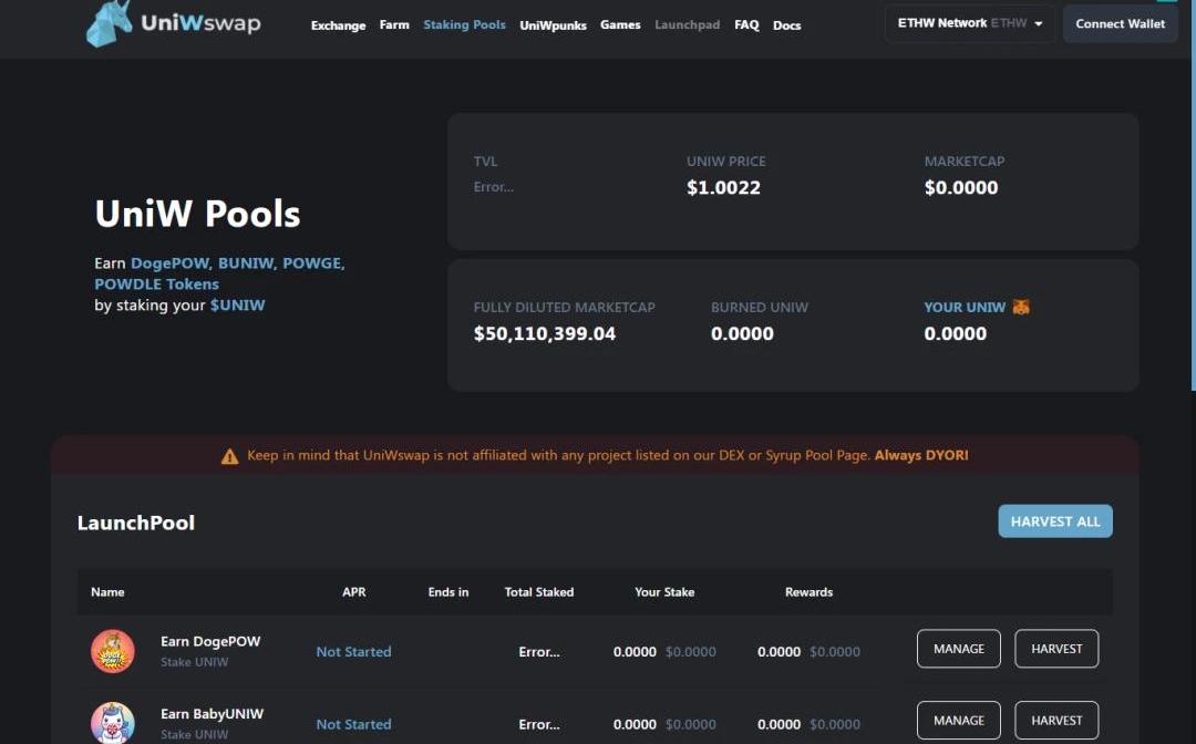 一個模仿Uniswap的DEX,除了具備交易、跨鏈、挖礦功能外,還有NFT:UniWpunks和基于UniWpunks的鏈游,未來還將推出發射臺。UniWswap是ETHW鏈上唯二鎖倉量超過$100萬的應用,近7天增長超30%,僅次于LFGSwap。此外,UniWpunks發售時所募集的所以UNIW都將被銷毀,而一半的ETHW將添加到流動性中。UniWswap在9月23日完成了Coinsult審計。當前UniWswapTokenUNIW約$0.1,市值約$120萬。借貸和穩定幣