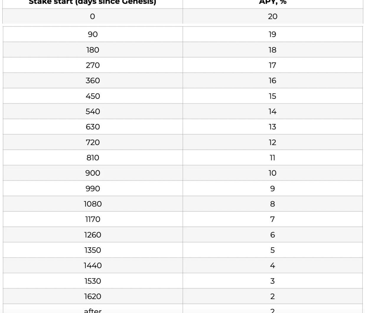 根據XEN的合約設計,當等待期結束后,用戶可以選擇質押XEN,質押期限為1-1000天。在約定的質押期限后用戶可以隨時終止質押XEN,且不會受到懲罰;但如果在質押期結束前終止質押,系統將不會按約定的年化收益率的比例支付獎勵。用戶可以在1-1000天之間的任何天數內質押XEN,并獲得對應的年化收益率獎勵,年化收益率從XEN創世鑄造時的20%開始,此后每90天減少1%,直到達到2%,此后將無限期地保持在2%。也就是說每個參與質押XEN的年化收益率在質押時已經確定,取決于自XEN創世以來已經過去多少天。