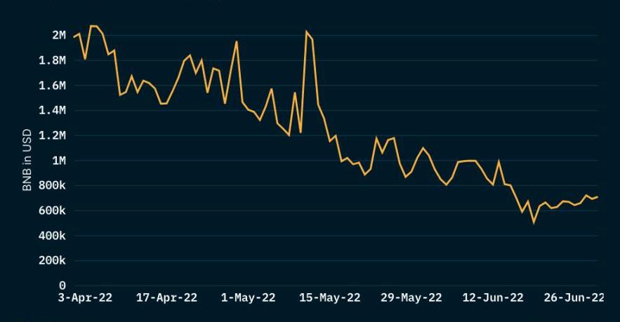 BNB的生態系統在第二季度已經發展到包括1,400多個dApp,其中流行的有PancakeSwap、Venus、AlpacaFinance、SecondLive、Era7、Mobox和TinyWorld。盡管當前的市場環境如何,但預計1b美元的生態系統基金和最近5億美元的投資基金將幫助生態系統發展壯大。