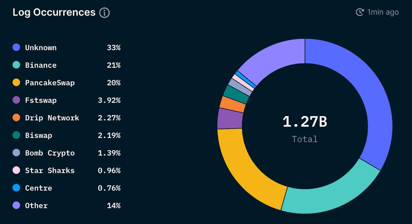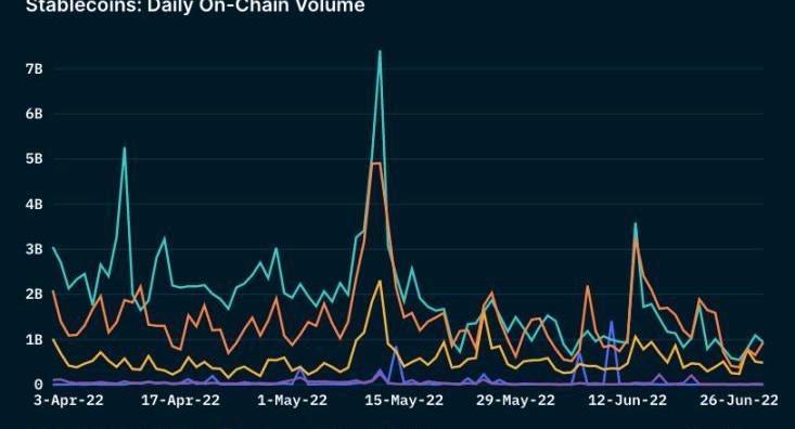 如前所述,PancakeSwap繼續主導幣安鏈上主要使用頻率,占鏈上所有交易的20%。第二季度其他值得一提的還有Era7、SecondLive、MOBOX和TinyWorld,本季度流行的Play-to-Earn游戲。此外,33%的「未知」標簽是指Nansen所有未標記鏈上實體的總和,而不是任何單個未知實體。BNB上的穩定幣交易量