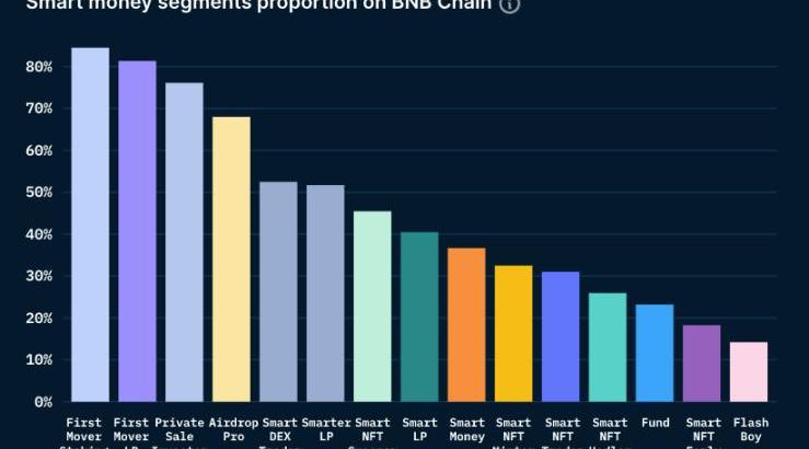 上圖顯示了BNB鏈上活躍的聰明錢地址在以太坊地址中所占比例的細分。它們已根據聰明錢的類型進行分類。大多數聰明錢繼續屬于沖頭礦質押者或流動性提供者,這可以通過鏈上此類活動的較高APY來解釋。鑒于自第一季度以來鏈上NFT活動的持續高增長,緊隨其后的是NFT上聰明錢。機構投資者是一個較小的部分,重疊率為23.2%。總鎖倉量TotalValueLocked
