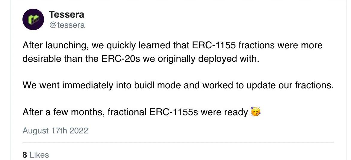 8月中旬,Tessera在推特上表示,在啟動后,我們很快了解到ERC-1155組分比我們最初部署的ERC-20s更加理想。非碎片化NFT是該領域的建設者面臨的最艱巨的挑戰之一。在Fractional中,非碎片化由代幣持有者對底價投票決定,底價是所有底價投票的加權平均值。當足夠多的持有者對最低價格進行投票時,就會觸發買斷,所有持有者都可以用他們的代幣換取ETH。這里明顯的問題是鯨魚能夠給出一個超過整個代幣持有者社區的出價。另一個碎片化項目Unicly試圖通過將在一個保險庫中捆綁多個NFT的碎片化來改進這一點,而不是像Fractional上的單個NFT。這允許用戶持有一個NFT資產集合的碎片化資產。雖然這在技術上不會讓鯨魚更難獲取整個NFT,但它保留了普通用戶的部分所有權。最后