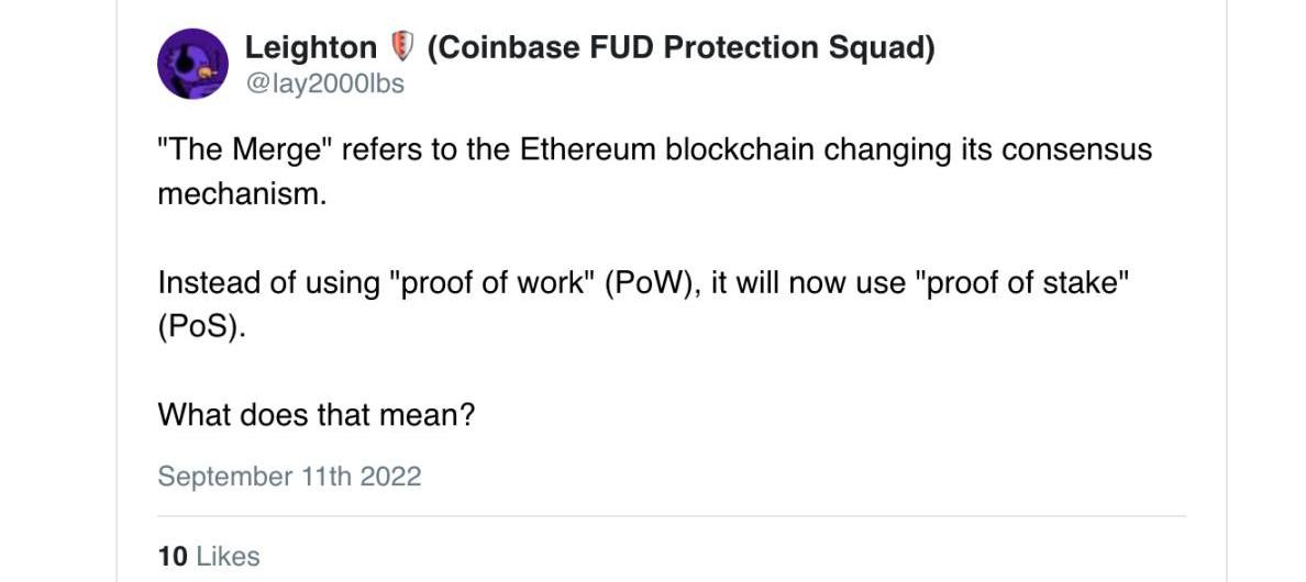 PoolTogether聯合創始人LeightonCusack表示,「合并」是指以太坊區塊鏈改變其共識機制。它不再使用「工作證明」,而是使用「權益證明」。這意味著什么?合并的tl;dr如下: