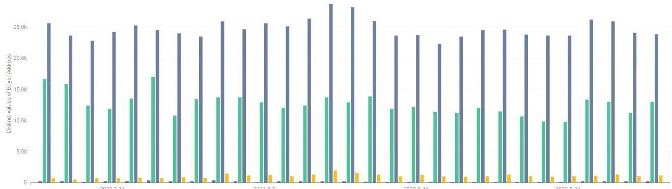 下圖顯示過去30天的購買活動。從用戶數量來看,OpenSea處于領先地位,MagicEden位居第二。