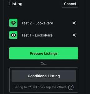 PrivatesaleonX2Y2在X2Y2的案例中,它不對這項服務收取任何費用,并且在這項交易中也免除了創作者的版權費。這一功能對于習慣于直接向其他收藏家進行銷售的用戶,或者在買方想要協商一個不同的價格,而買方又不希望在搜索上輕易獲得的情況下,是非常有用的。什么是上線條件掛單?條件掛單允許賣家在以下條件下出售兩件商品:如果其中一件已售出,則另一件將從列表中刪除。LooksRare是唯一提供此選項的NFT交易市場。