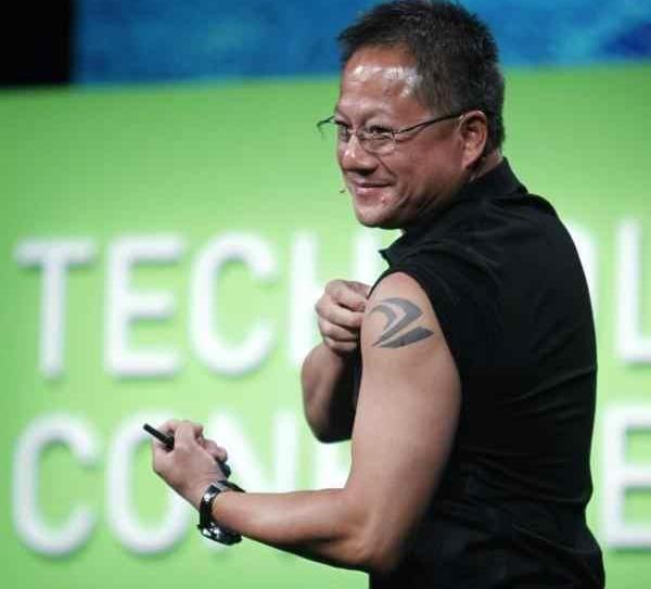 Vitalik在中文社區的活動上發表演講,圖片源自網絡同時,以太坊在國內的忠實群體也在不斷壯大。除了Ethfans,ECN、以太坊最大礦池之一Sparkpool,以及當時國內流行的imToken錢包都在持續地為以太坊作出貢獻。他們當中有礦工、有交易員,還有早期的「DeFi傳教士」,他們會定期翻譯Vitalik的文章并在中文社區傳播,舉辦研究以太坊最新主題的線下聚會,甚至幫Vitalik解決在微信上的技術問題。又一次,中國社區挑起了以太坊生態發展的大梁,為它提供了安全的算力和充裕的資金。而大洋彼岸,對區塊鏈的關注和熱情同樣高漲,比特幣、以太坊、IC0成了財經媒體每日必報的焦點,生怕自己錯過新的內容和潮流。不過在離加密賽場不遠的硅谷,媒體的聚光燈卻忽視一個看似與區塊鏈毫不沾邊的重要人物,他也在這輪牛市里嘗到了以太坊起飛的甜頭。從2016到2018年,英偉達的市值從140億美元增長到了1750億美元,這個硅谷巨頭的價值在兩年時間里翻了十倍之多,驚掉了所有投資者的下巴。僅2017一年,英偉達的營業收入就達到了97.14億美元,環比增長40.58%。作為CEO,黃仁勛對公司的表現十分滿意,為此還在自己左臂上搞了一個新的紋身。乍一看上邊的數據,你可能并不會把它與17年的以太坊甚至是加密市場扯上關系,但其實仔細觀察后,我們就能發現二者之間異常緊密的聯系。不夸張地說,17年的加密牛市,為英偉達帶來了相當豐厚可觀的回報。