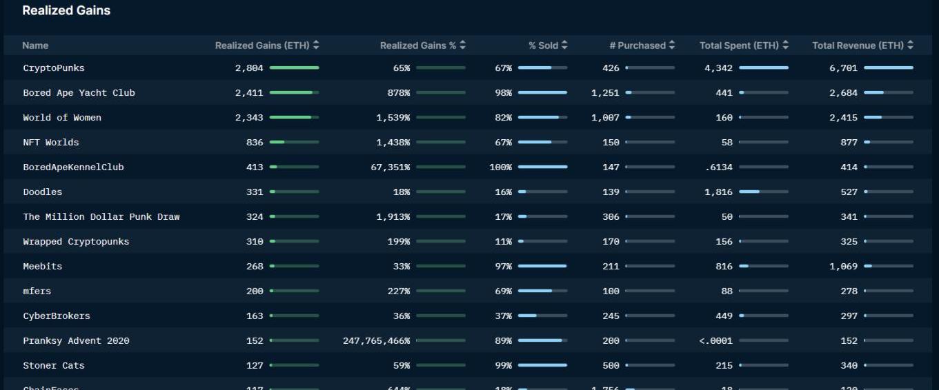 Shaw是一位獲利巨大的NFT收藏家,于2021年2月加入OpenSea,與moin3au.eth類似,他在CryptoPunks和Meebits收藏中獲得了巨大收益,并且最近開始購買生成藝術ArtBlocksCurated作品。Shaw花費了1230ETH,并產生了13200ETH的收入,總利潤為12000ETH。然而,到目前為止,錢包只售出了78%的集合,并且仍然擁有這個NFT集合的2個,并且將來可能會通過賣掉這些來獲利。在不到兩年的時間里,這款錢包在其原始投資倒手轉賣NFT上的收益超過了10倍,而Shaw是NFT交易的典范,這使得這款鯨魚錢包成為追隨者的絕佳選擇。